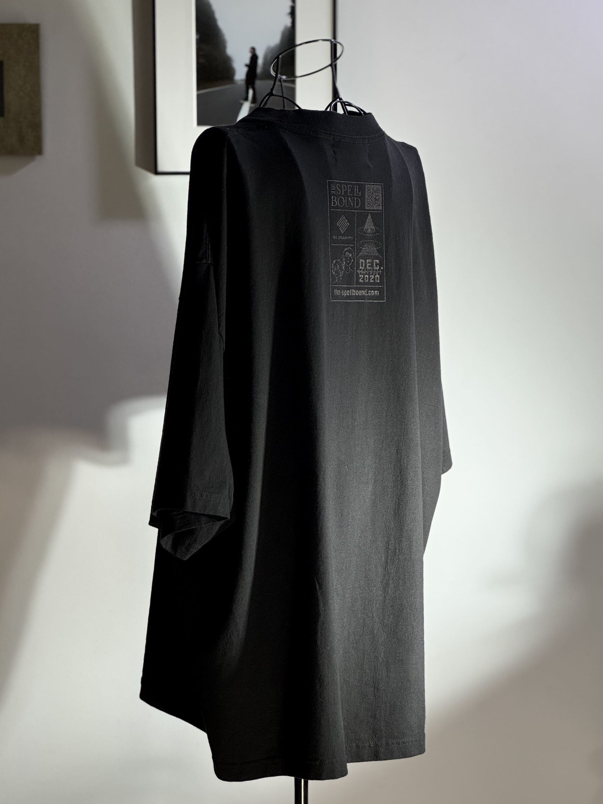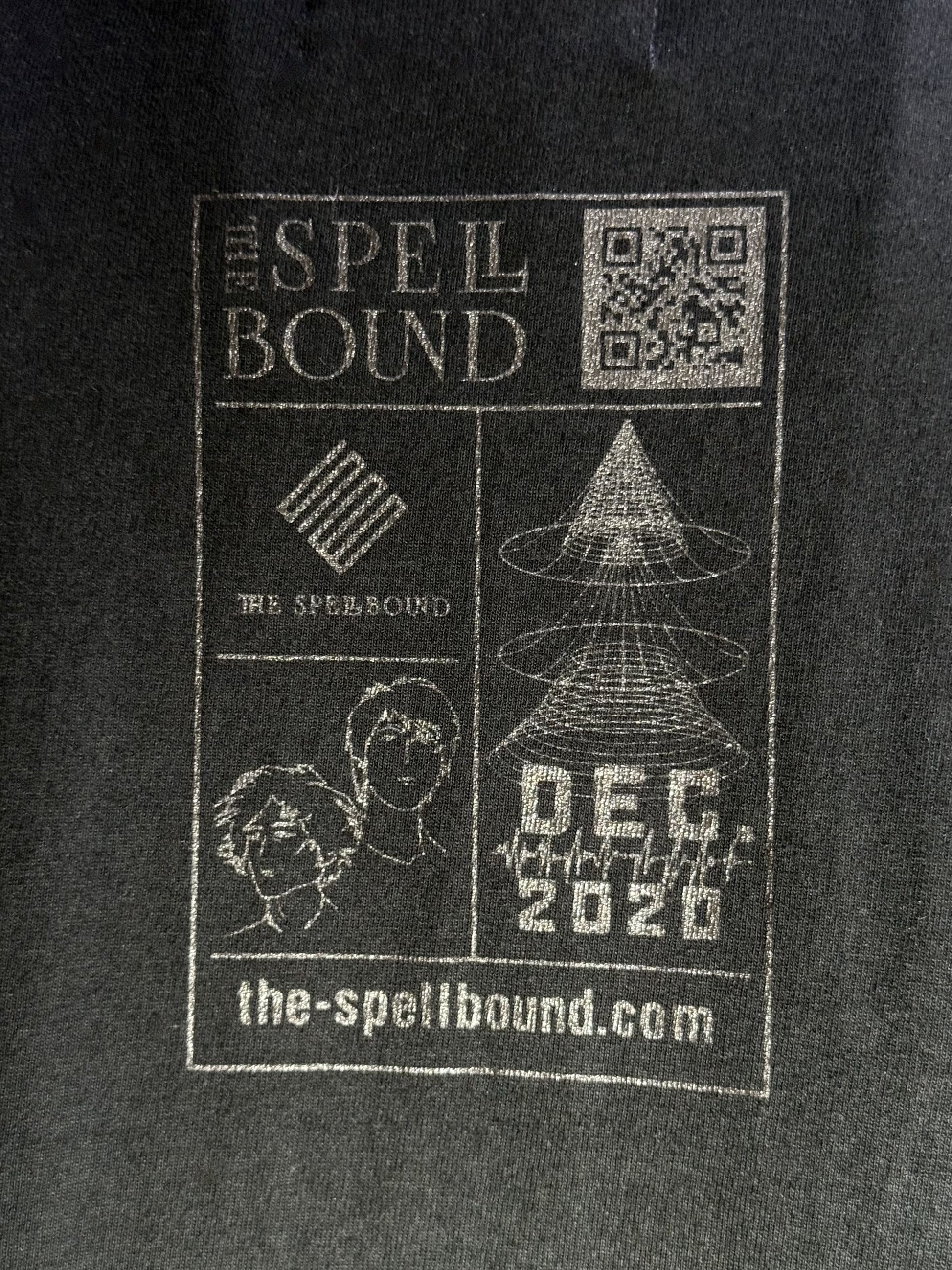 特別なプリント仕様 グレーのプリントカラーは赤系の色目にこだわり、ツヤ感のあるラバープリントで高級感を演出。フロントには存在感のある「THE SPELLBOUND」ロゴを配置し、バックには特別なアートワーク - QRコード、バンドのシンボリックなグラフィック、キャラクターイラスト、バンド始動記念の年号「DEC 2020」、オフィシャルサイトURLなど、バンドにまつわる要素が巧妙にレイアウトされています。